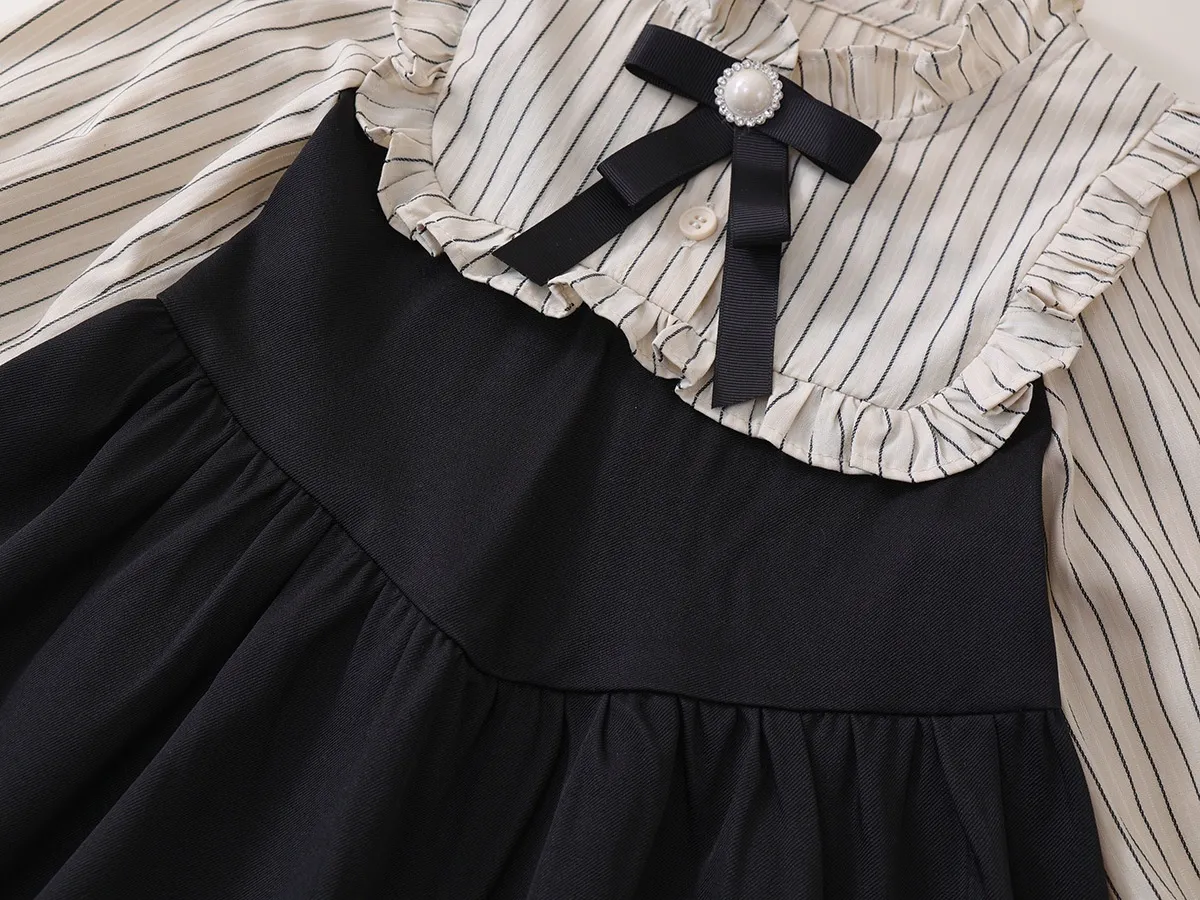 The Fake Two-piece Korean Striped Contrast Color Long Sleeve Skirt features a clever two-piece illusion, combining a long sleeve top with a skirt that looks like a matching set. This style eliminates the need to coordinate separate pieces, making it a go-to outfit for busy mornings when your child wants to look stylish without spending time putting together an outfit.