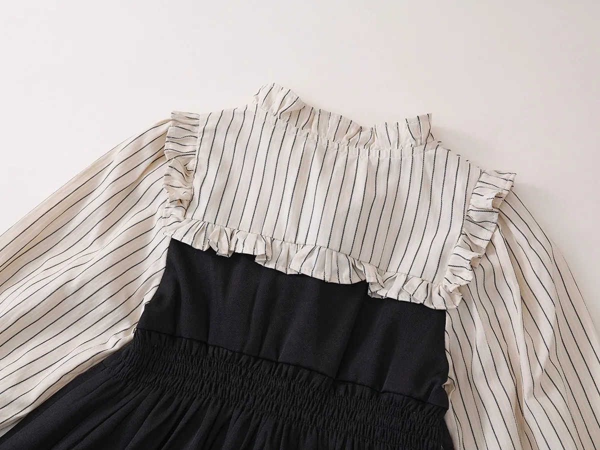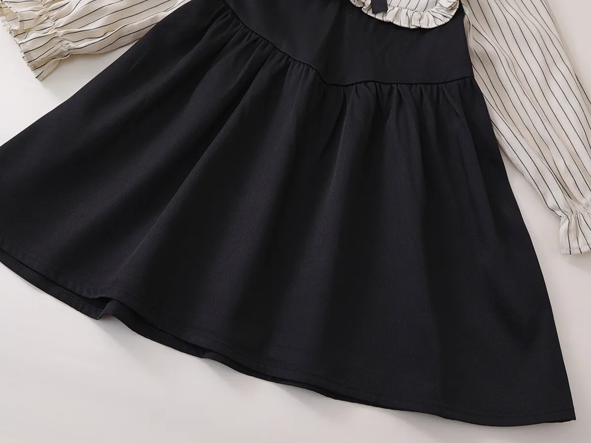 The Fake Two-piece Korean Striped Contrast Color Long Sleeve Skirt is the perfect blend of comfort, style, and modern fashion. Whether it’s for school, a special occasion, or just a casual day out, this outfit offers a fun, youthful look that stands out while providing comfort. With its striking striped pattern, soft fabric, and easy-to-wear design, it’s a must-have for any young girl who loves to express her personality through fashion.