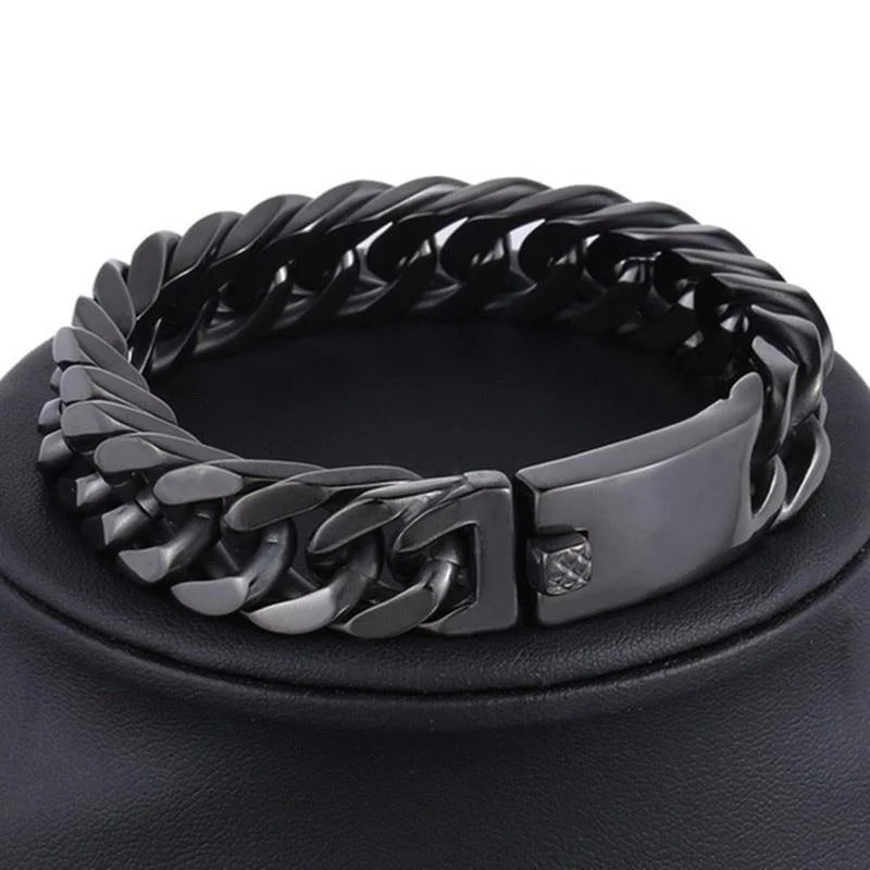 The Cuban link style is renowned for its interlocking, flattened links that create an appealing texture and reflect light from multiple angles. Widely popularized by hip hop culture, the Cuban chain serves as a symbol of urban luxury and personal flair. With a sleek black finish, this bracelet steps away from the typical gold or silver tones, offering a fresh, edgy twist to a classic design.