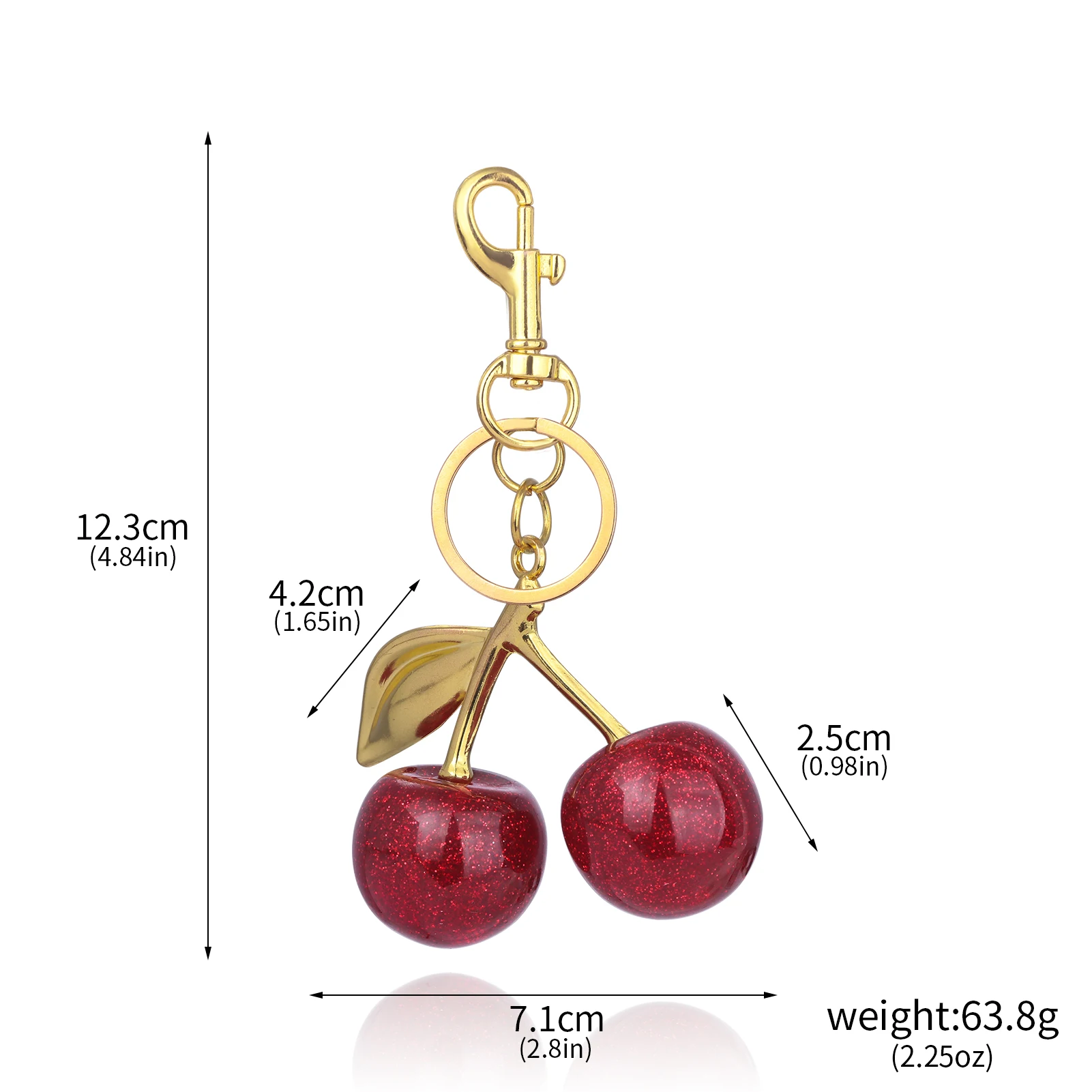 This keychain features bright red cherries crafted with high attention to detail, giving it a realistic look that will instantly catch the eye. The cherry pendants have a glossy finish that enhances their vibrant color, making them look fresh and appetizing.