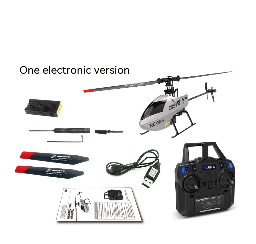 Color box packaging *1, helicopter *1, remote control *1, manual *1, USB charger *1, main propeller *2, tail propeller *1, connecting rod