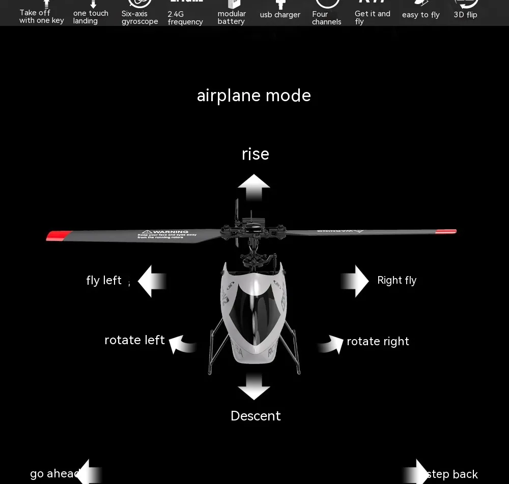 power and body self stability. Simple 4-channel design with 6-axis gyroscope for ultra stable flight;