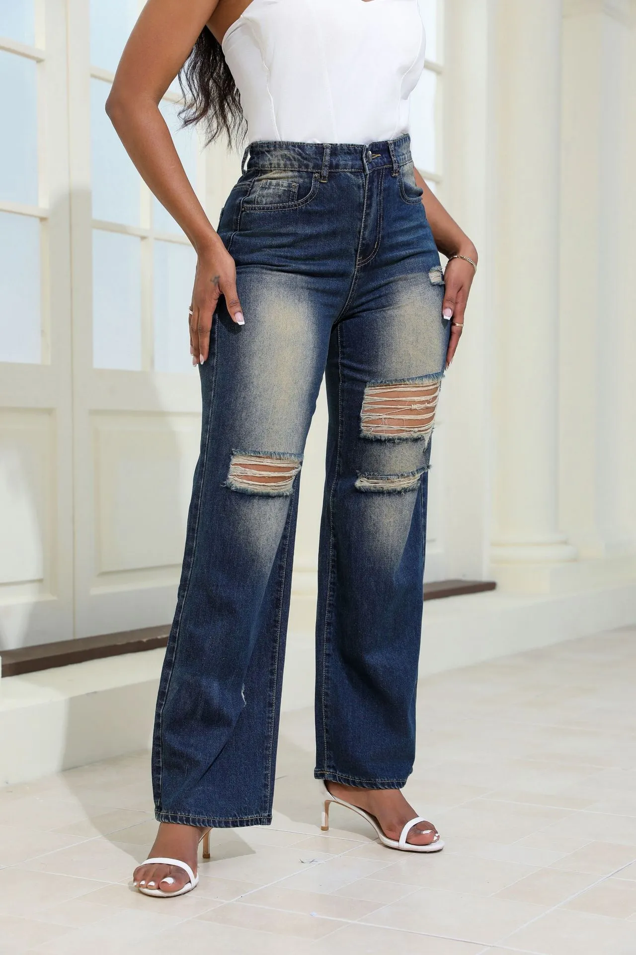Fashion High Waist Ripped Jeans With Pockets Comfortable Slim Fit Trousers Straight Wide-leg Pants Womens Clothing