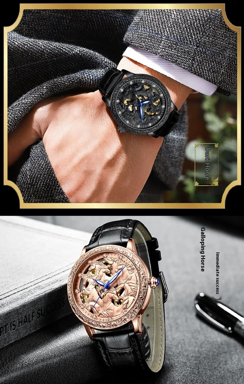 The Fashion Hollowed-Out Automatic Mechanical Waterproof Watch is a masterpiece of style and engineering. Its unique hollowed-out design reveals the intricate workings of the automatic mechanical movement, making it not just a timepiece but a statement of sophistication. Combining modern aesthetics with high-performance functionality, this watch is perfect for every occasion, whether it's a business meeting, casual outing, or formal event.