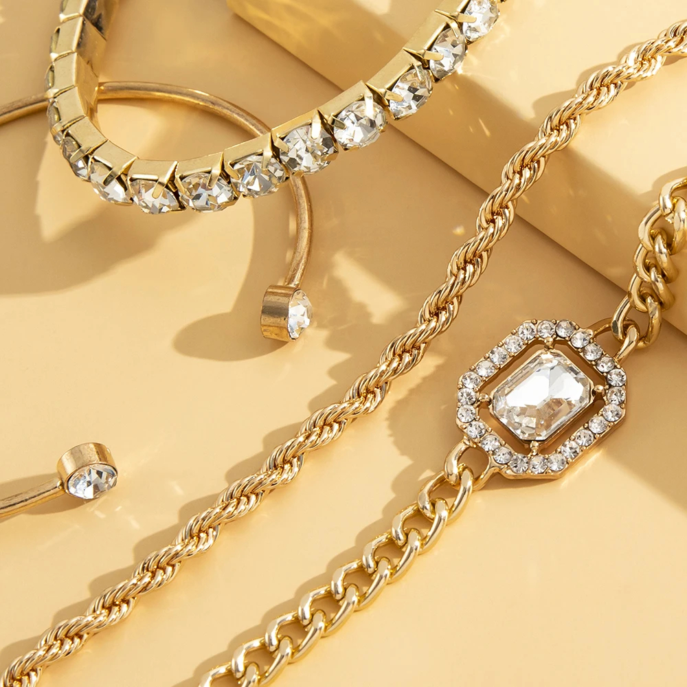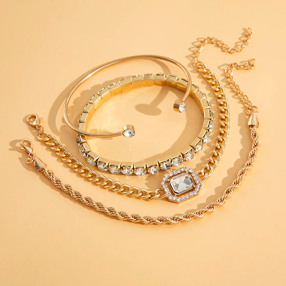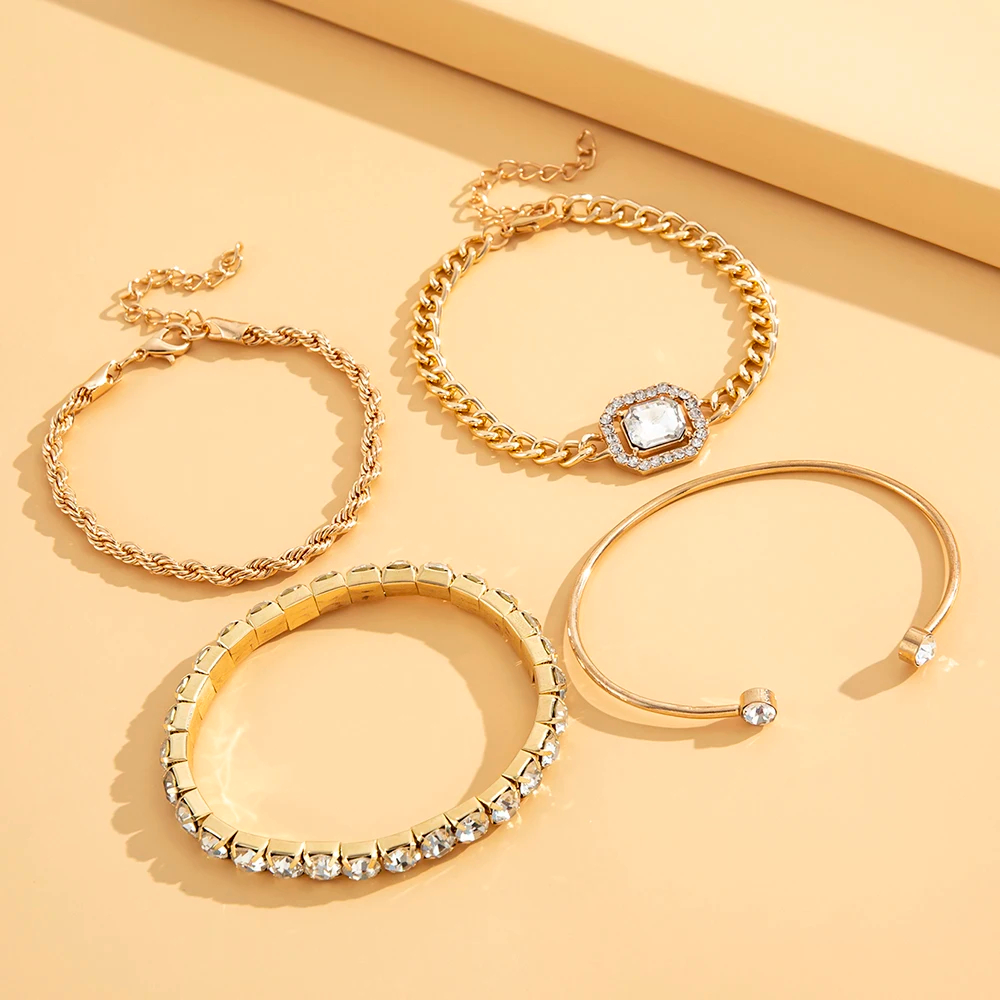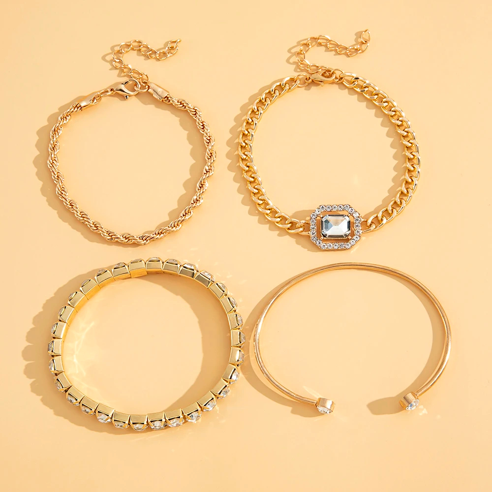 4Pcs Bracelets: This set of women's bracelets includes different styles of bracelets: Fried Dough Twists bracelets, punk gem bracelets, square crystal bracelets open crystal bracelets and so on. These crystal bracelets can be worn separately or paired with other jewelry to give a more layered look.