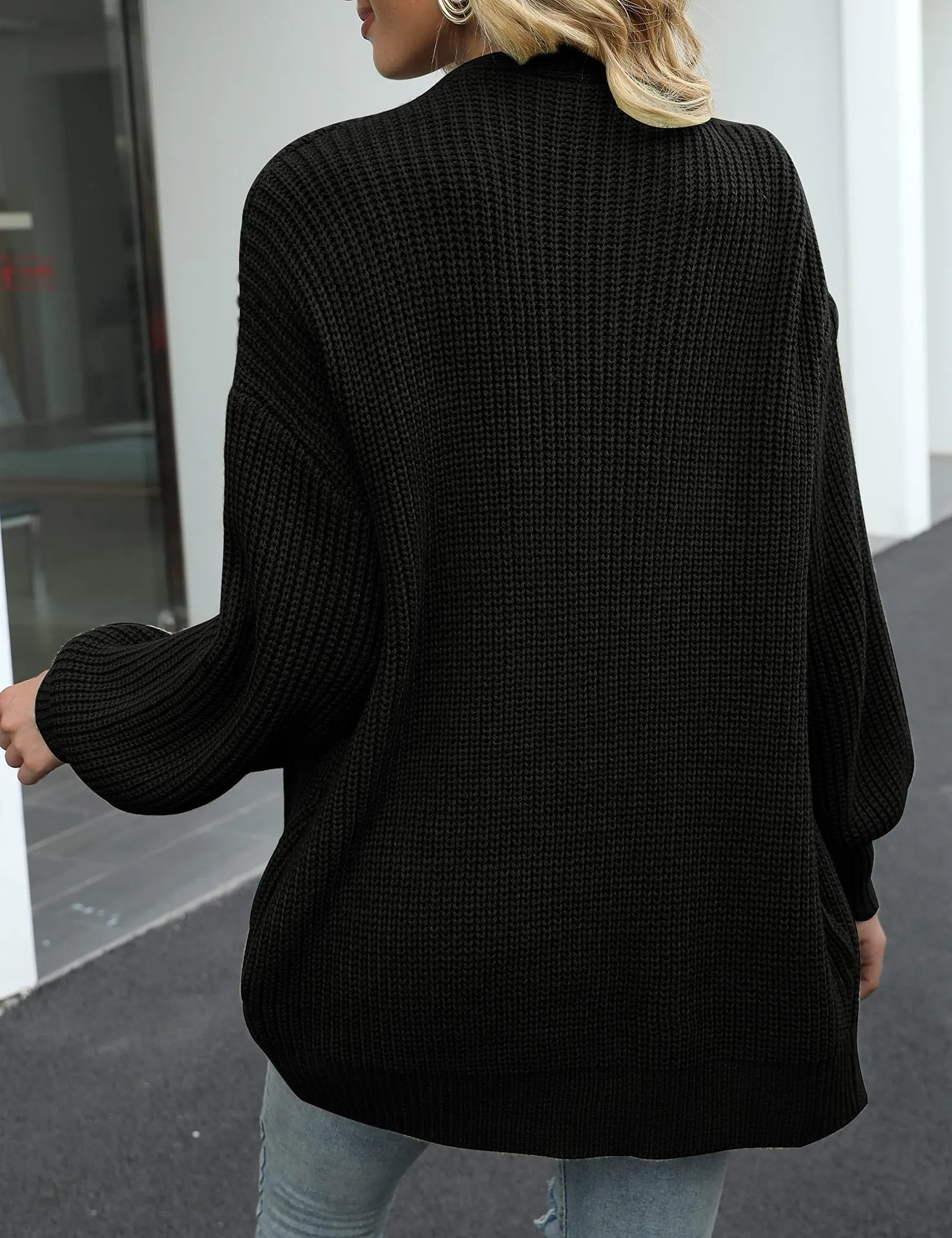 Fashion Lantern-sleeved Sweater With Pockets Casual Loose Solid Knit Cardigan Autumn Tops Womens Clothing