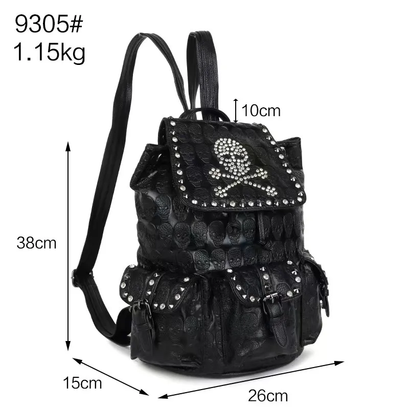 for those who embrace individuality, this backpack features striking skull rivets, sparkling diamond accents, and premium faux leather