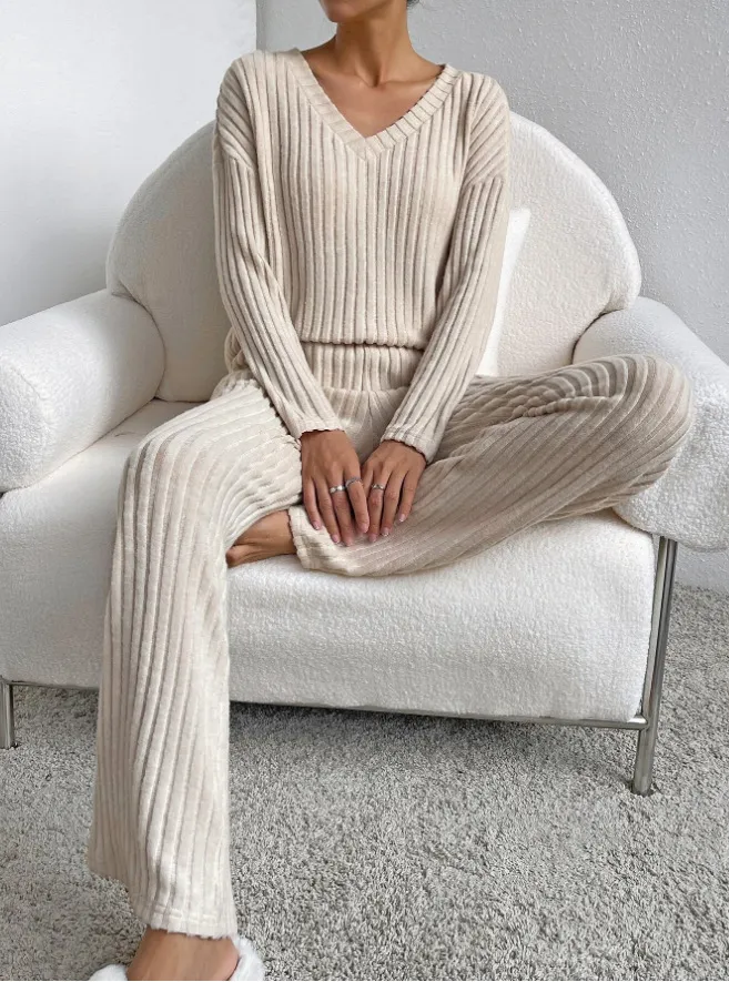 Fashion Solid Striped Suit V-neck Long-sleeved Top And Casual Straight Pants Loose Temperament Women's Clothing