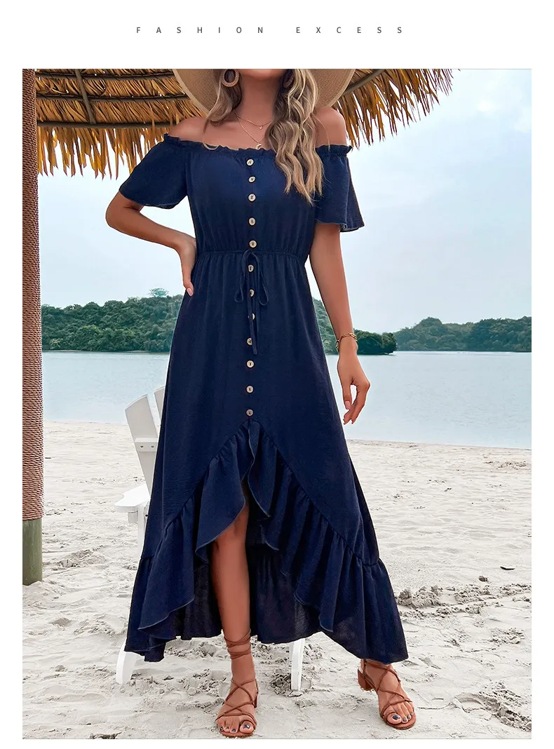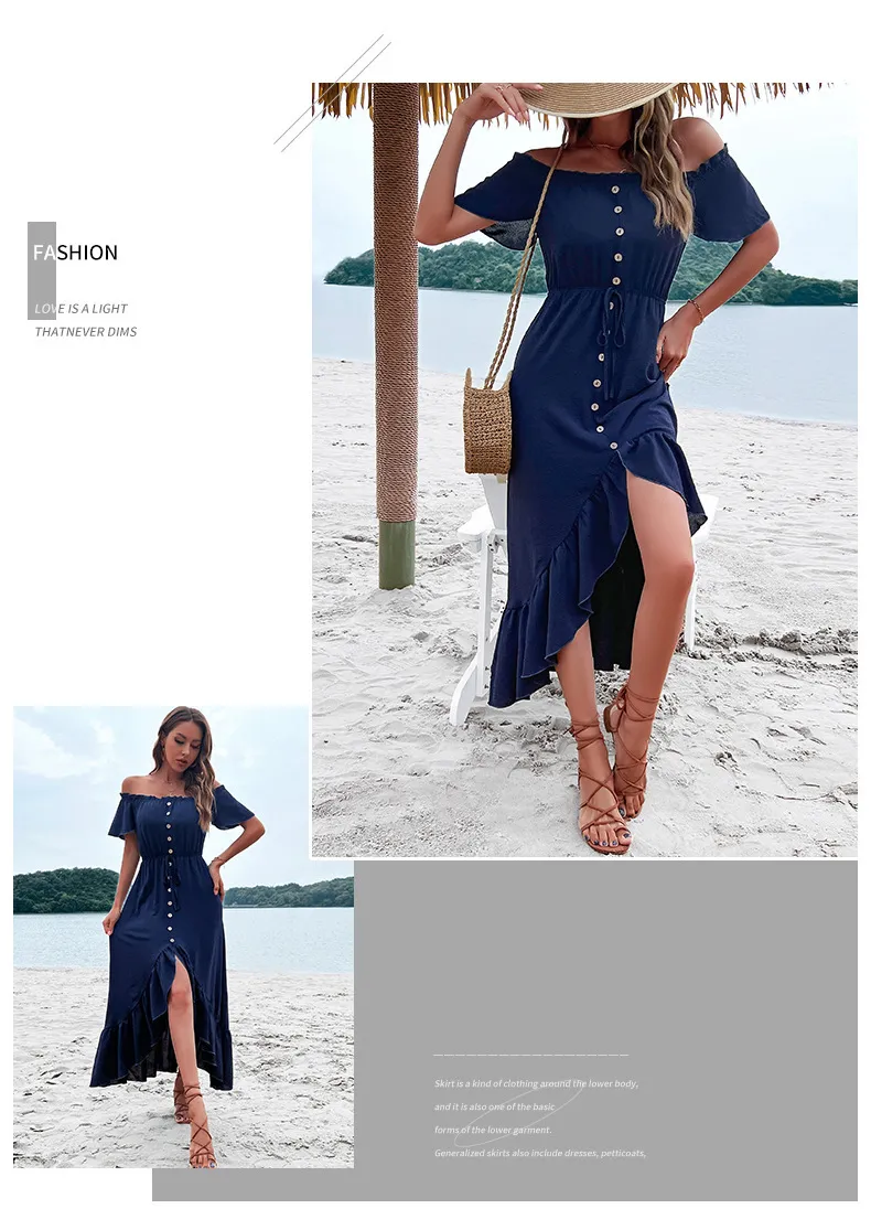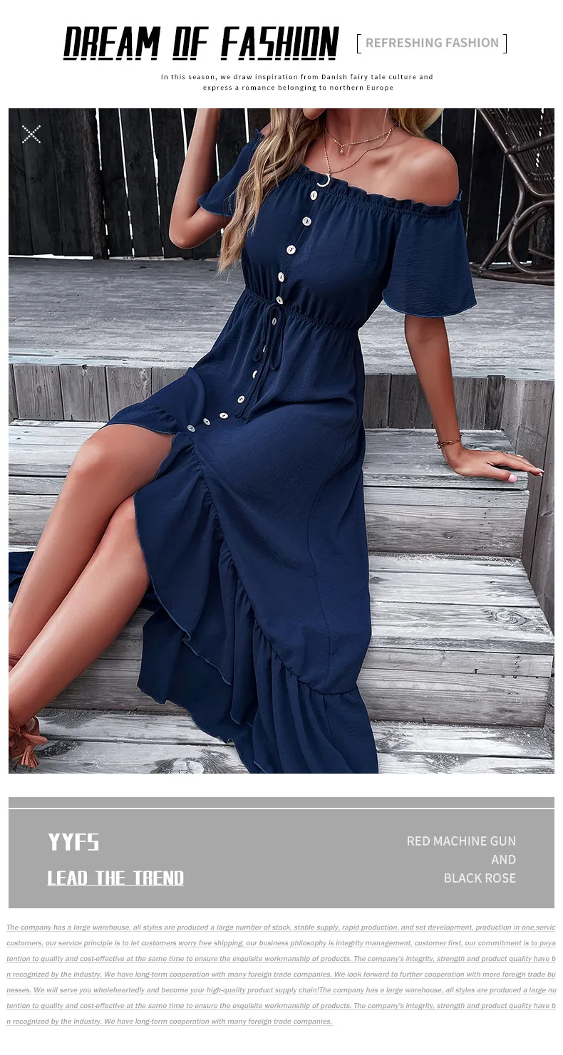In conclusion, the Fashion Women's Wear Off-Shoulder Ruffle Sleeve Irregular Dress is the perfect blend of sophistication and modern style. The off-shoulder neckline, ruffle sleeves, and irregular hemline create a chic and flattering look that suits a variety of occasions. Made from high-quality, breathable fabric, this dress ensures both style and comfort, making it ideal for warm weather or semi-formal events. Whether you’re attending a brunch, a party, or a night out, this dress is a versatile and fashionable option that keeps you looking chic and feeling confident.