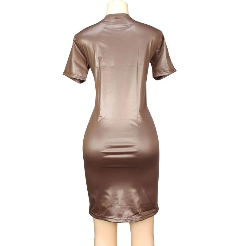 The Faux Leather Long Sleeve Round Neck Knee Sheath Tight Dress is the perfect blend of daring and elegant, designed to