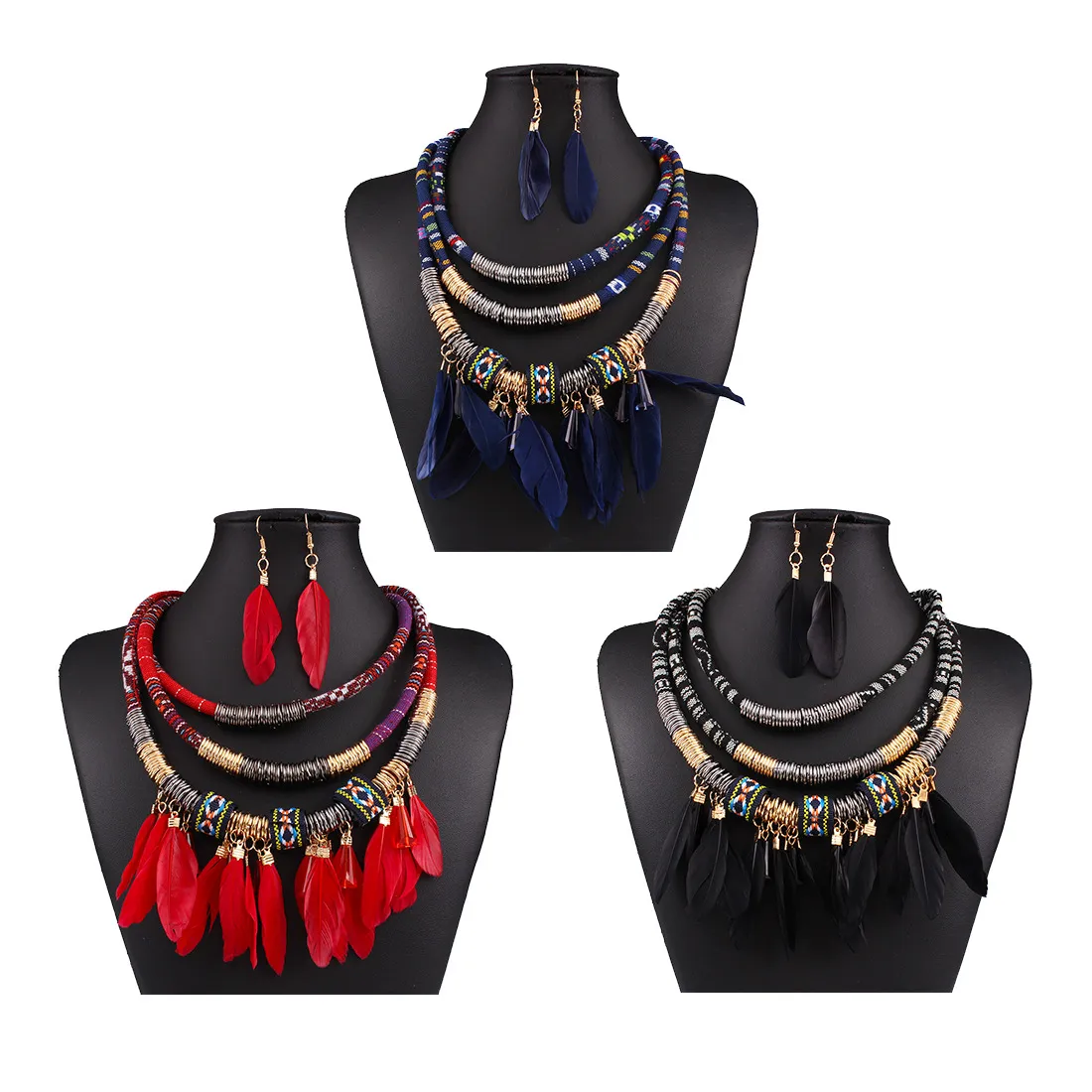 Feather Tassel Necklace Earrings Set: Bold, Bohemian Elegance