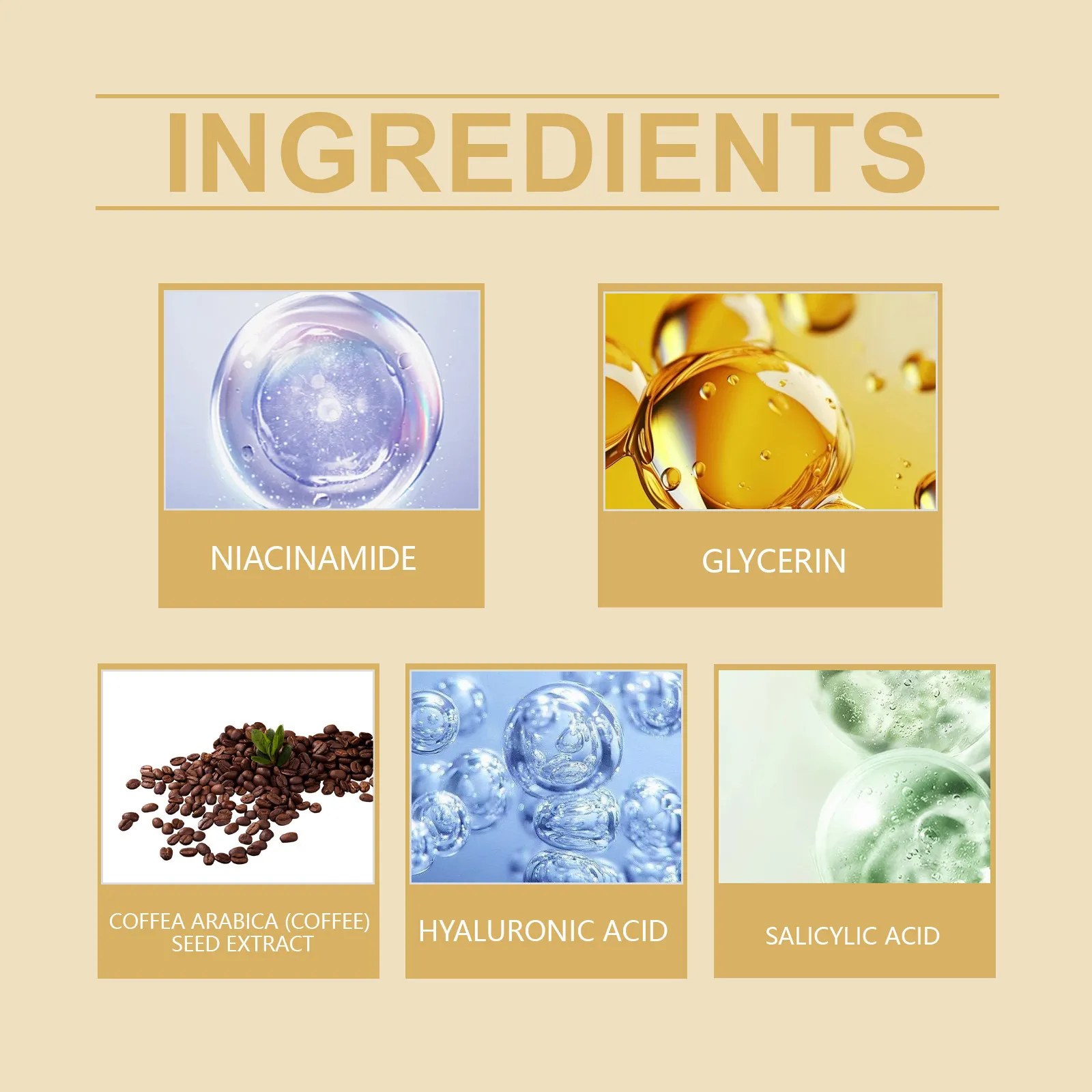 Ingredients: glycerol, hyaluronic acid, coffee seed extract, salicylate, nicotinamide