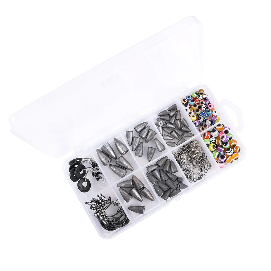 60 6mm fish-eye retaining beads, 40 8mm fish-eye retaining beads, 5 M-size space beans, 1#2/0# crank hooks 10 each, 8mm double loops 20, 4#