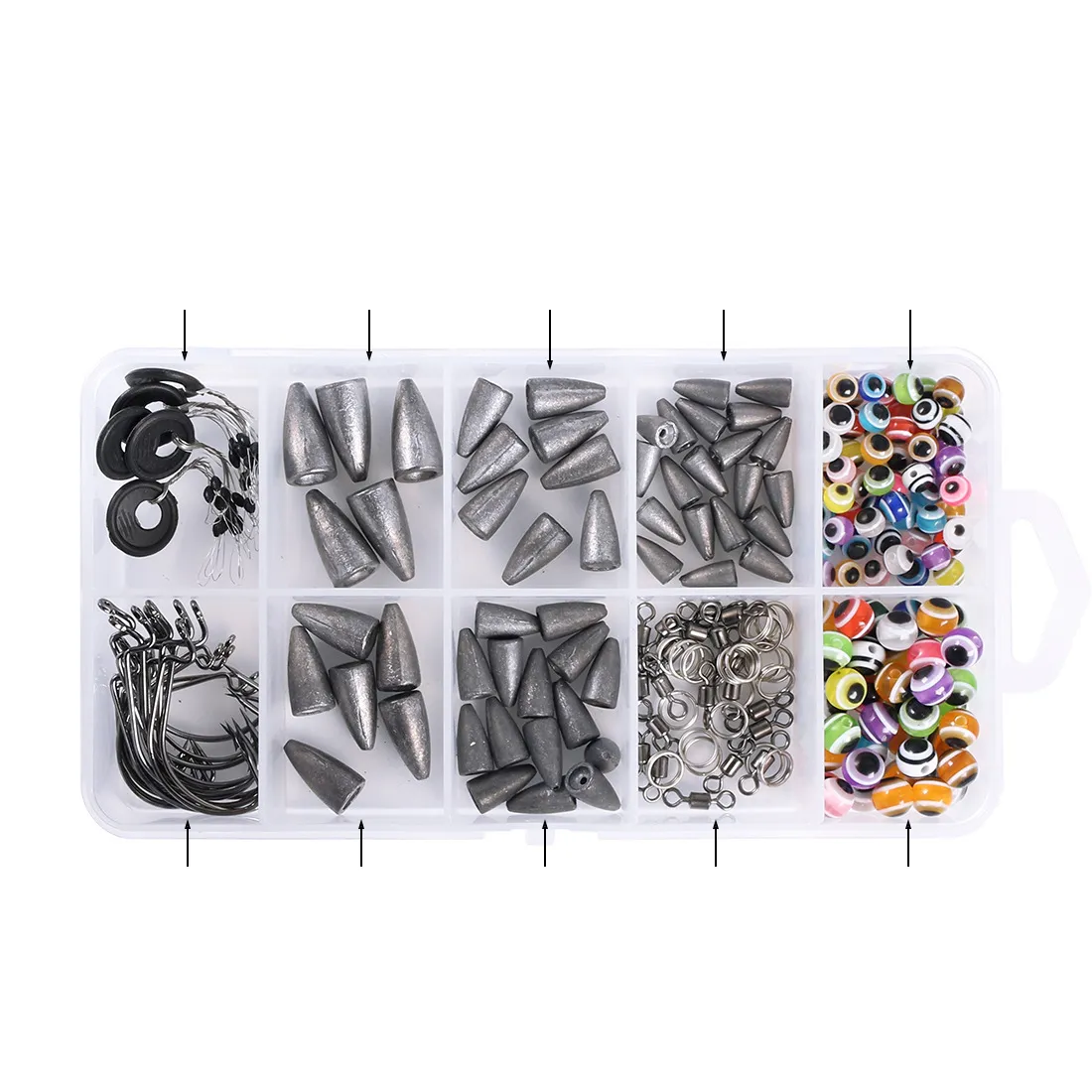 60 6mm fish-eye retaining beads, 40 8mm fish-eye retaining beads, 5 M-size space beans, 1#2/0# crank hooks 10 each, 8mm double loops 20, 4#