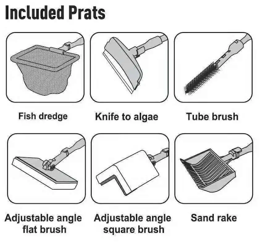 Versatile Cleaning Attachments: Brushes designed for different tasks, including algae scraping, glass cleaning, substrate