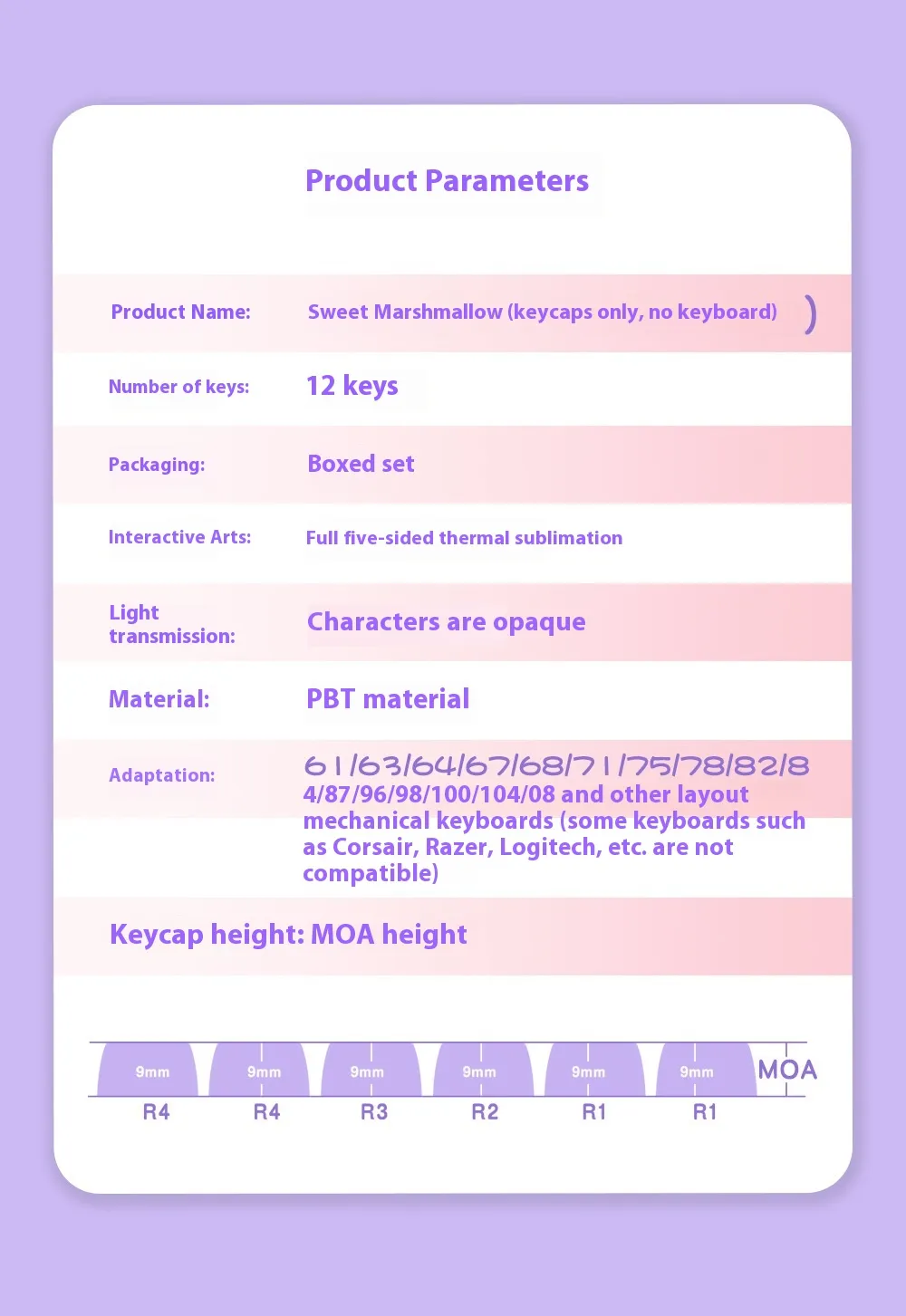 five-sided sublimation keycaps, MOA profile keycap set, PBT mechanical keyboard keycaps, personality keycaps NZ, cute gaming keycaps.