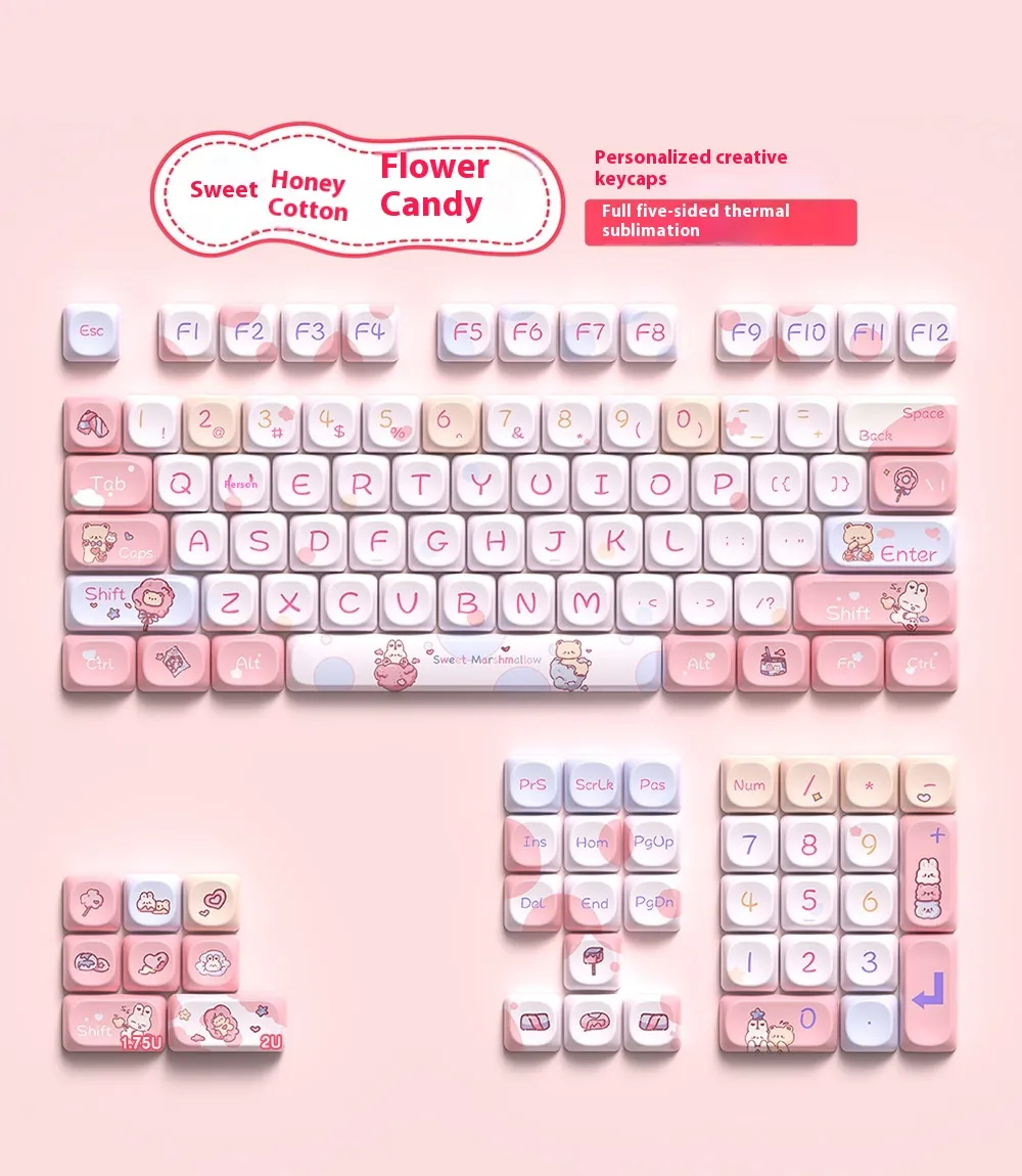 The Five-sided Sublimation MOA Highly Cute Personality Fit Mechanical Keyboard Cap set brings together playful design and premium keycap craftsmanship. Each keycap features five-sided dye-sublimation printing, meaning the legend/design wraps not just on the top but also across the front face and side faces of the keycap—giving you full-style personality from multiple viewing angles. Made from durable PBT plastic, the keycaps resist shine and wear, ensuring that the cute visuals stay vibrant. The “MOA” profile (a variant similar in height to Cherry profile) ensures a comfortable typing or gaming experience. This set is designed to fit standard mechanical keyboards with Cherry-MX compatible stems, covering full layouts from 61-key to 108-key.