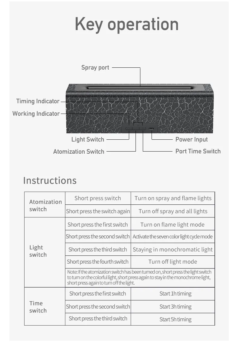 Functions: humidification, aromatherapy, timing, atomizer, ultrasound, mute, lighting, diffusion, other