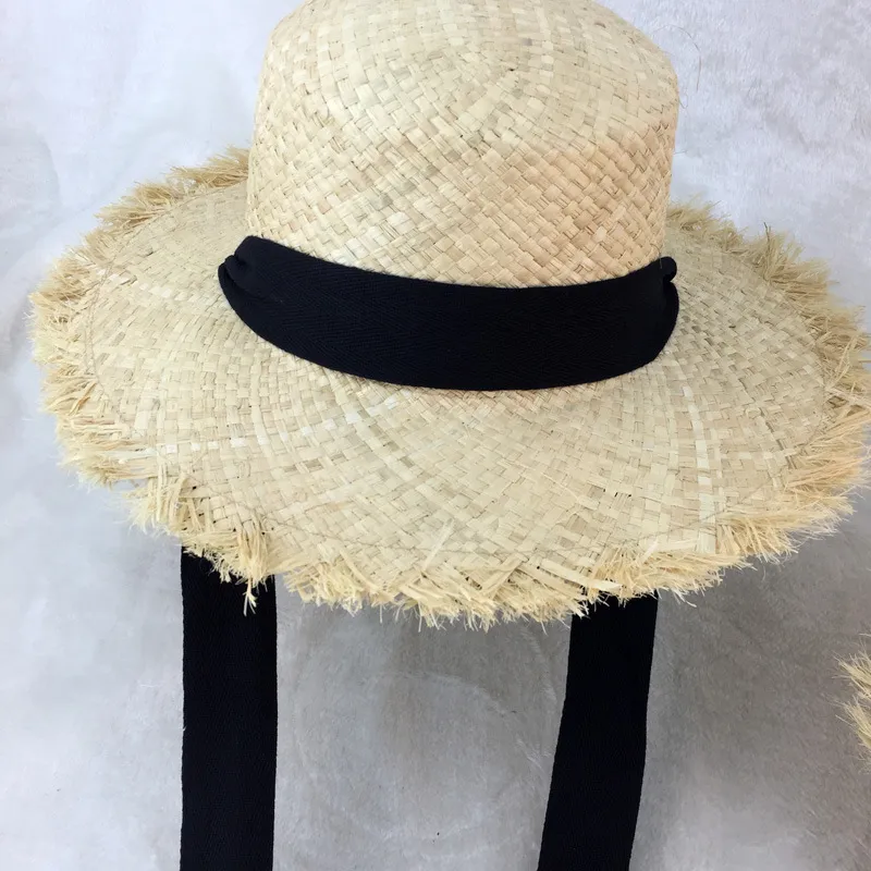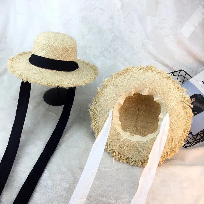 Flat-top raffia large-edge burred cotton ribbons with sunshade and sunscreen straw hat vacation beach hat tide