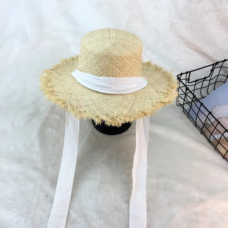 Flat-top raffia large-edge burred cotton ribbons with sunshade and sunscreen straw hat vacation beach hat tide