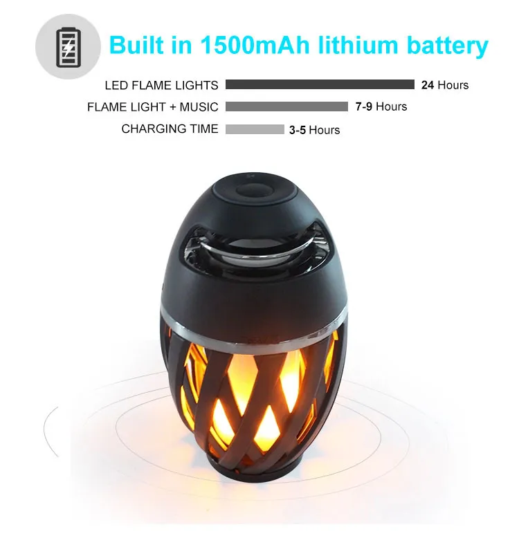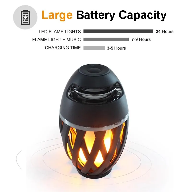 The Flight-Carrying Flame Bluetooth Speaker Box is equipped with a rechargeable battery that offers long hours of music playback and lighting. The battery ensures that you can enjoy your favorite music and the calming flame light without constantly needing to plug in the speaker. The efficient battery allows for hours of uninterrupted enjoyment.
