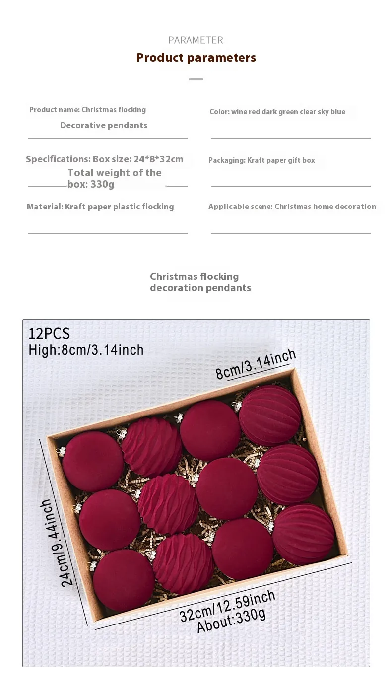 The flocking technique gives the balls a soft, snow-like texture that mimics the feeling of freshly fallen snow, adding depth and dimension to your tree. The wine red and dark green colors evoke the warmth and joy of the Christmas season, blending beautifully with traditional and modern holiday themes alike.