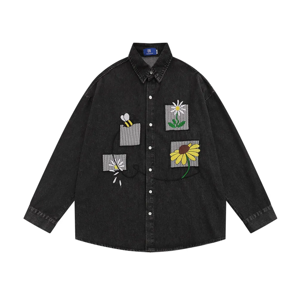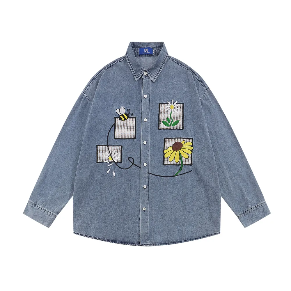 Floral Embroidery Denim Washed Long Sleeve Shirt Coat – Casual and Chic with a Polo Collar