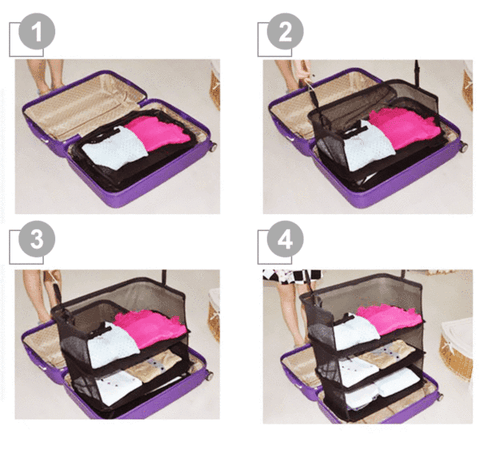 Bring this: COLLAPSIBLE and portable 3-layer travel wardrobe along your trip, you can easily keep your clothes wrinkle-free in a tidy and organized way.