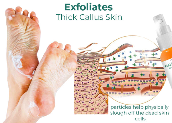 Natural plant extracts and botanicals with calming, healing, and exfoliating effects are the main focus of the key ingredients. The spray composition makes application simple and precise. The liquid form of the spray makes it easier to penetrate calloused skin and delivers active ingredients to soften and exfoliate the hardened skin cells when applied to the afflicted region.