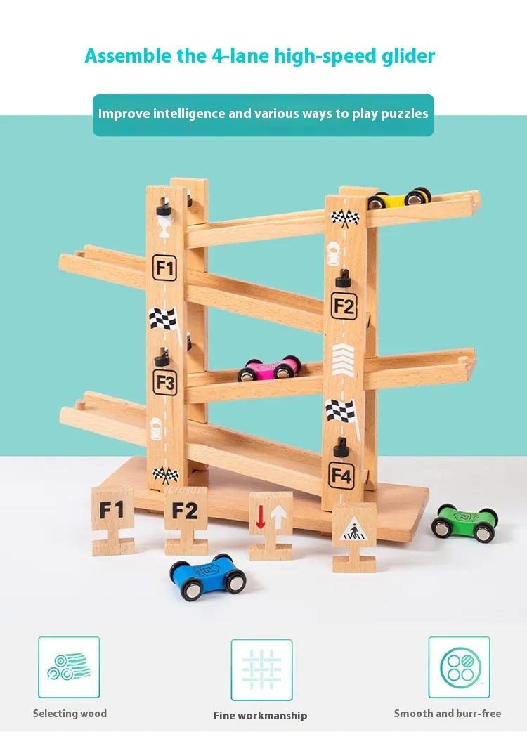 Four Track Gliding Car Children Educational Assembly Track Wooden Toy