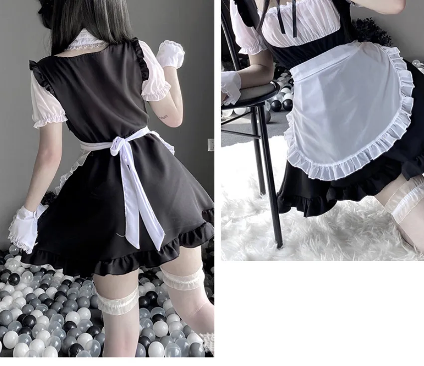 The traditional French maid outfit includes a short, black dress or skirt, often paired with a white apron. The dress typically features lace, frills, or ruffles, creating a feminine and elegant appearance. The outfit is often completed with a lace headband or bonnet, gloves, and high heels or stockings, embodying the playful, seductive, and elegant aesthetic.
