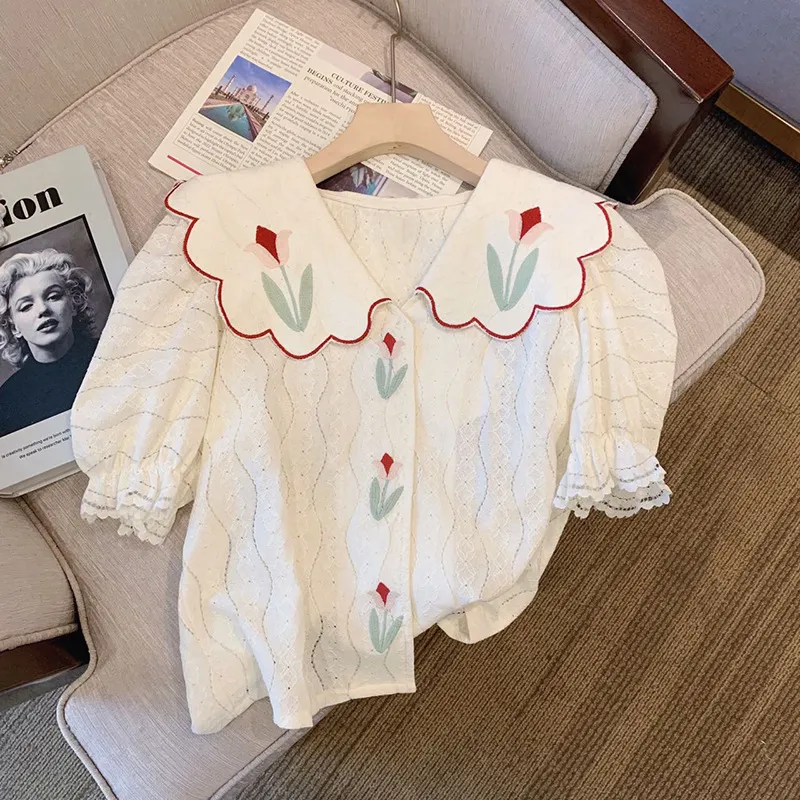French Style Doll Collar Embroidered Printed Short Sleeve Shirt