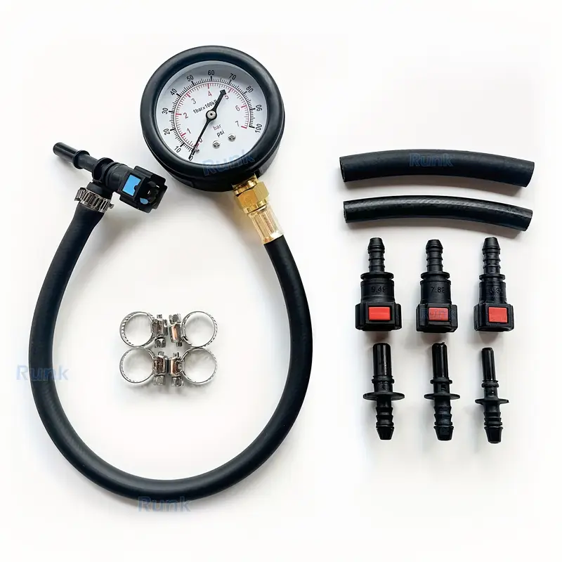 3 size connectors suitable for automobiles and motorcycles, Quickly Connected Fuel Pump Pressure Tester Gauge With Valve 0-100PSI 0-7Bar Fit for different types of adapters. new types, old types Gauge Read 0~100psi / 0~7Bar With Valve, can check One Section By One Section Material: Metal + rubber
