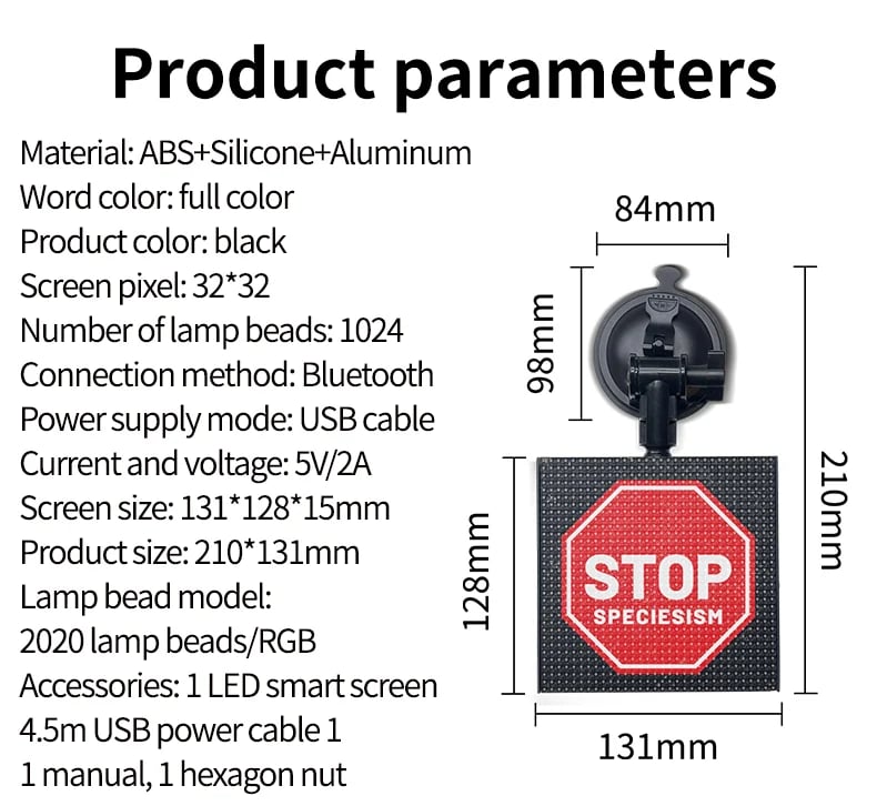 The LED display is designed with adjustable suction cups for easy installation and optimal positioning. The compact black display measures 210x131mm and features 32x32 pixels with 1024 LED lamp beads. The package includes the LED display screen, sucker holder, and a manual in both English and Chinese.
