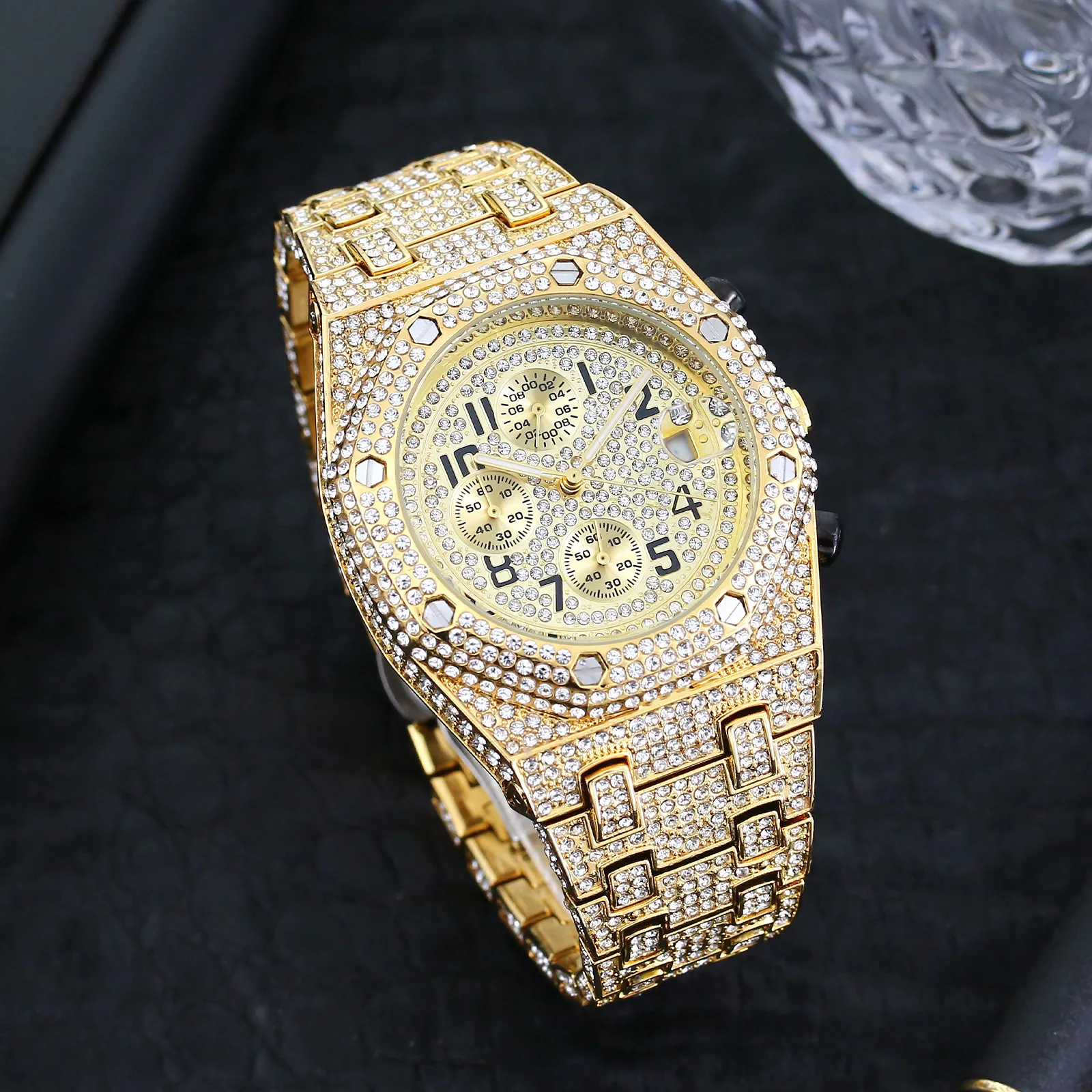 Full Diamond Three-Eye Timing Sports Quartz Men’s Watch: A Fusion of Luxury and Precision