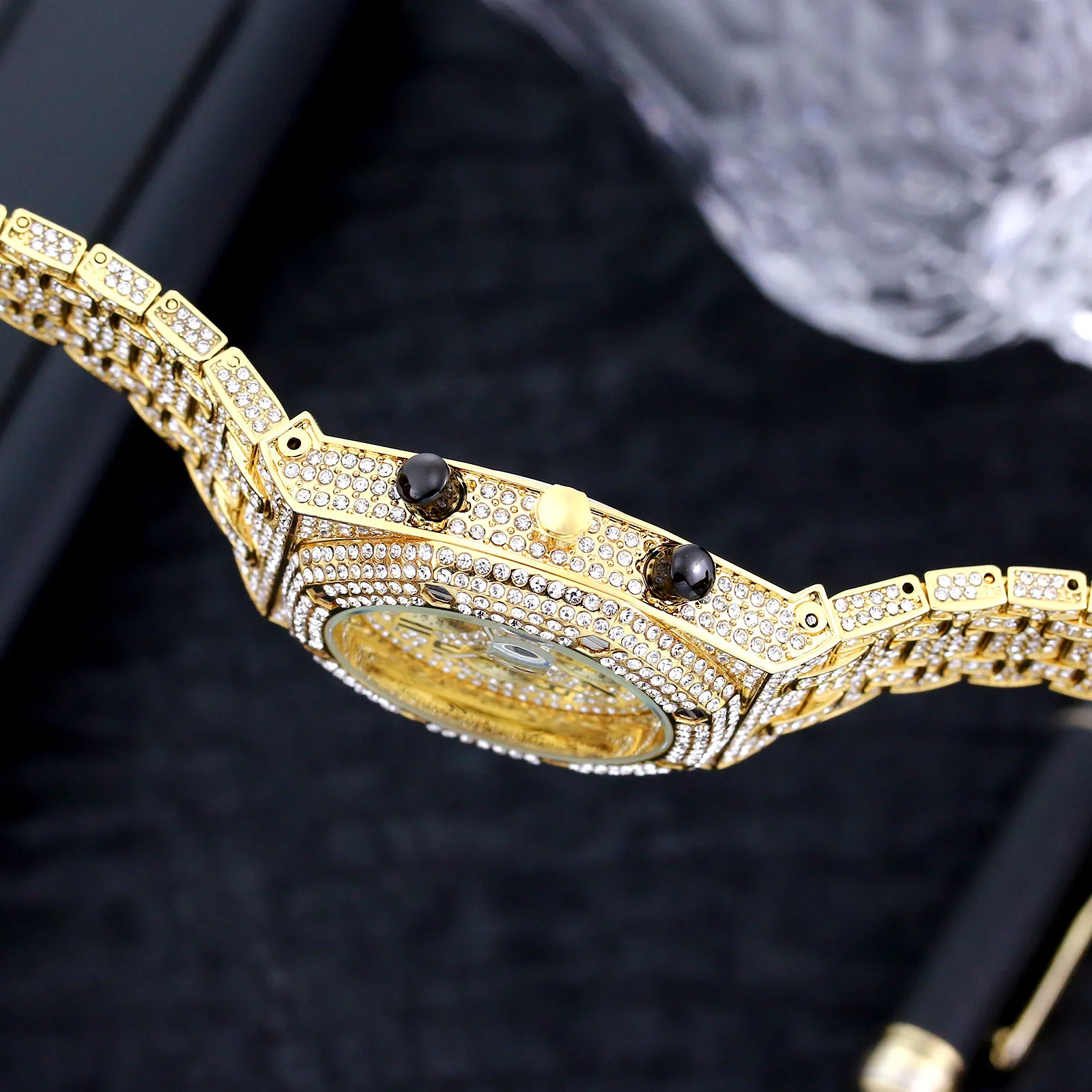 The most striking feature of this watch is the full diamond embellishments around the bezel, adding a luxurious touch of sparkle and elegance. The watch is perfect for individuals who appreciate luxury without compromising on functionality. The diamonds not only elevate its visual appeal but also make it the ideal choice for special occasions or everyday wear, exuding sophistication and refinement.