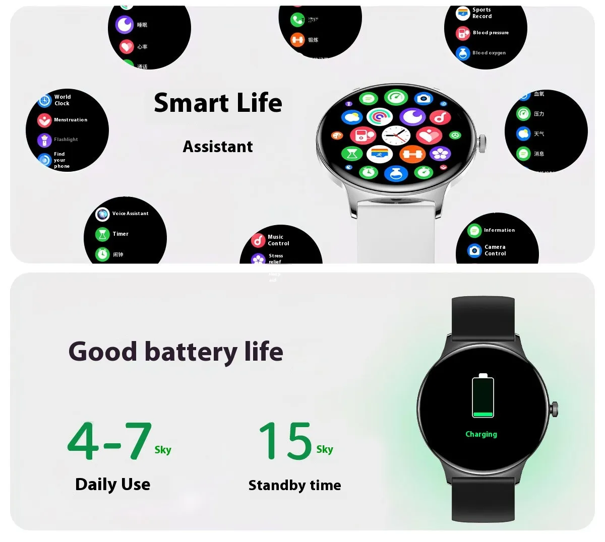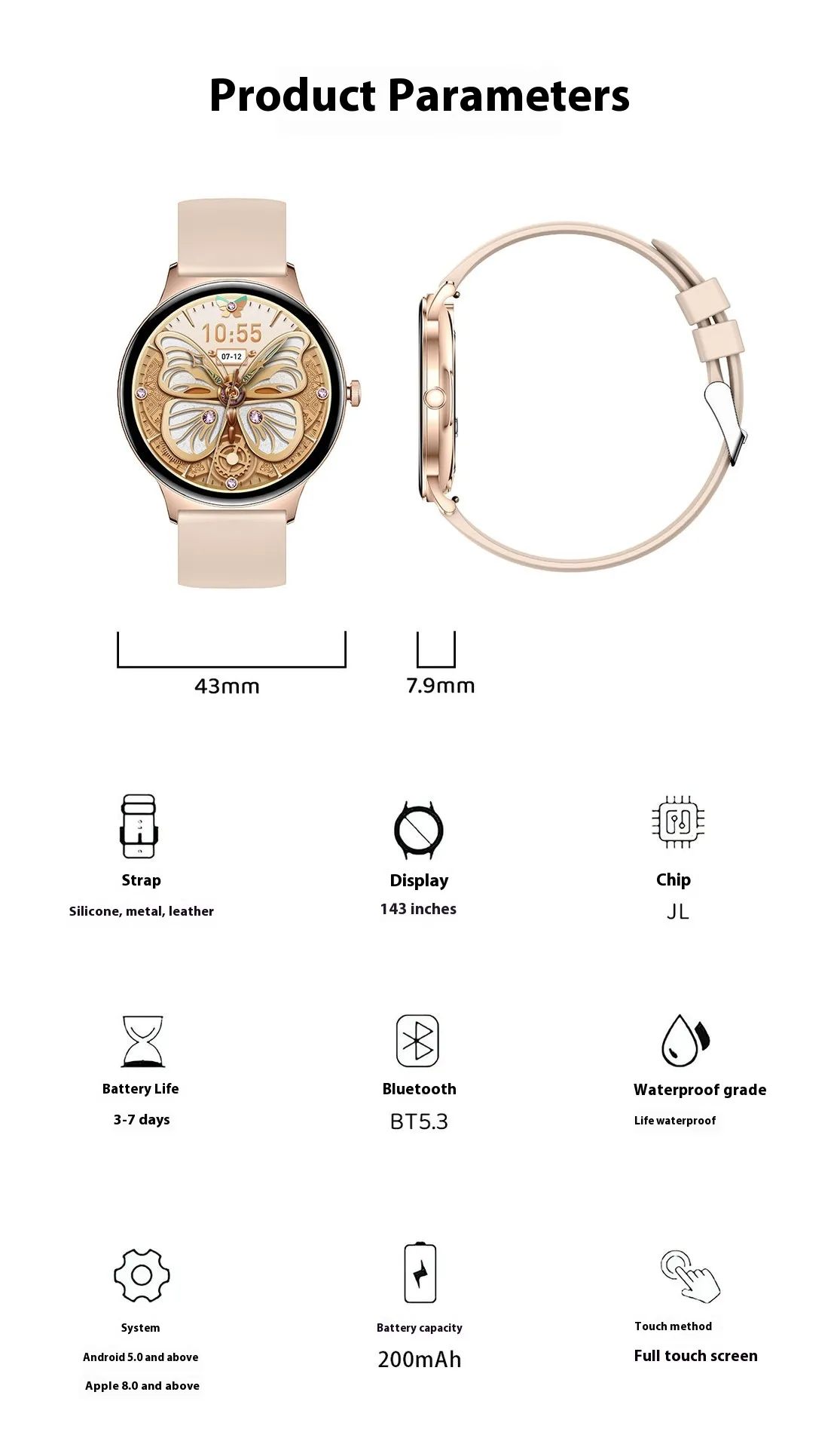 Functions: Waterproof, photographing, step counting, heart rate monitoring, blood pressure measurement, social entertainment, Bluetooth