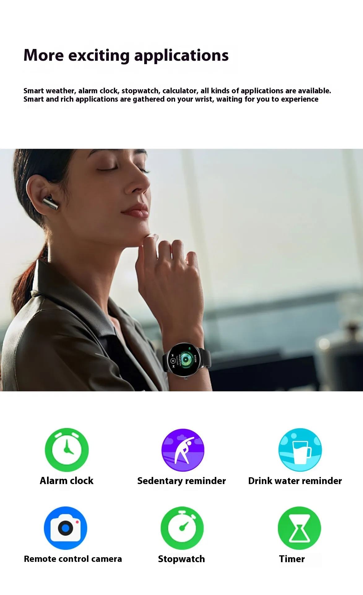 calling, smart reminder, remote control selfie, sleep monitoring, blood oxygen detection