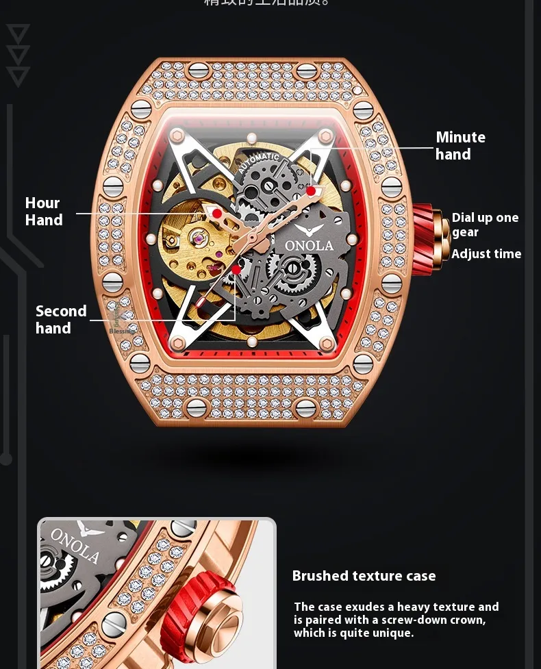 Forget about the hassle of battery changes. This watch features automatic movement, powered by the natural motion of your wrist. The rotor inside the watch winds the mainspring as you move, providing energy to keep the watch running. This feature eliminates the need for batteries, making the watch more eco-friendly and reducing maintenance costs while ensuring continuous timekeeping.