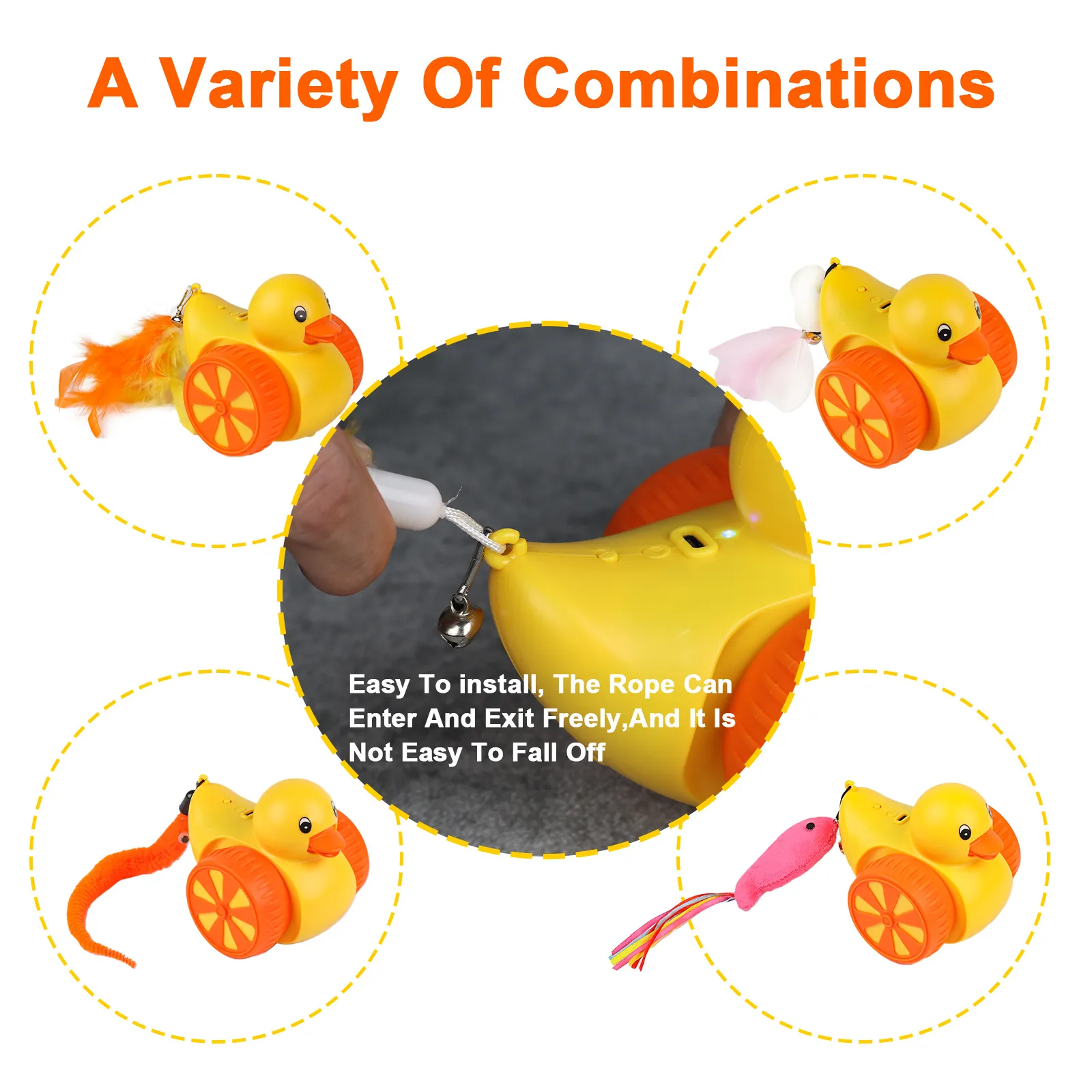 5、 The product has a hook design at the tail for easy replacement of toy accessories. The product is paired with feathers with bells and a