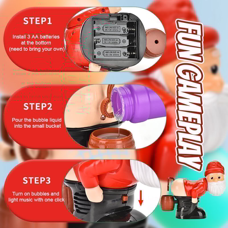 - One-Touch Music & Bubbles: Simply insert 3 AA batteries, fill the bucket with bubble solution, and press the button to start the fun! The Santa Claus bubble machine combines hilarious fart sounds with twinkling lights, creating a playful and magical experience.