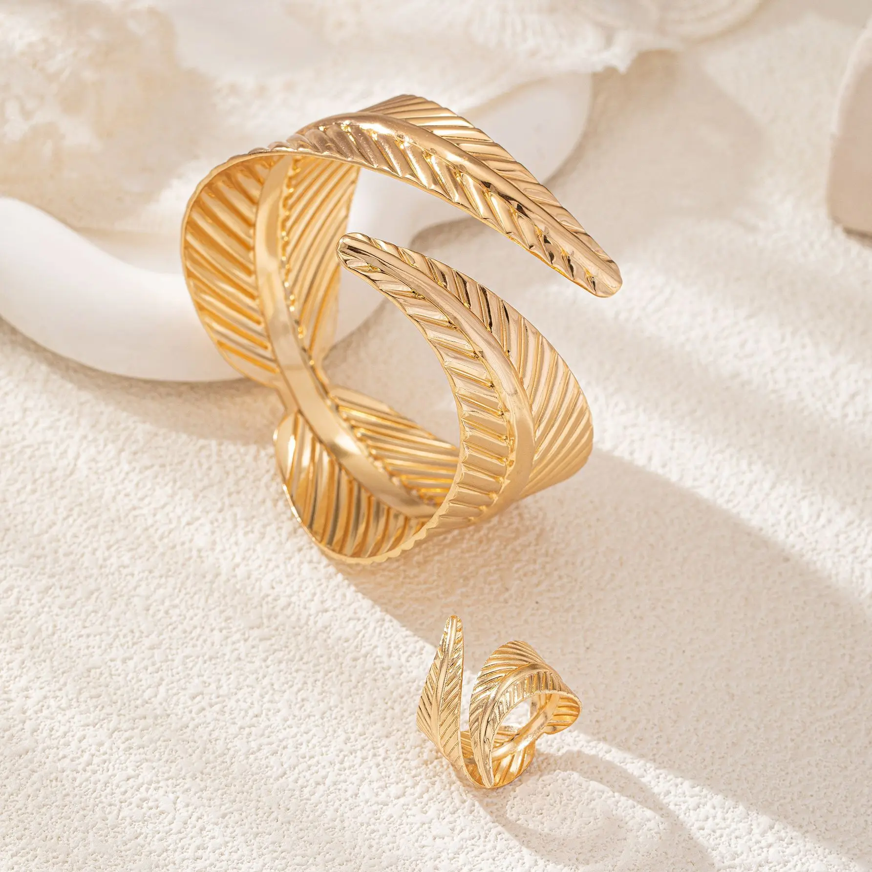 Geometric Crossing Leaves Cuff Bangles and Ring Set
