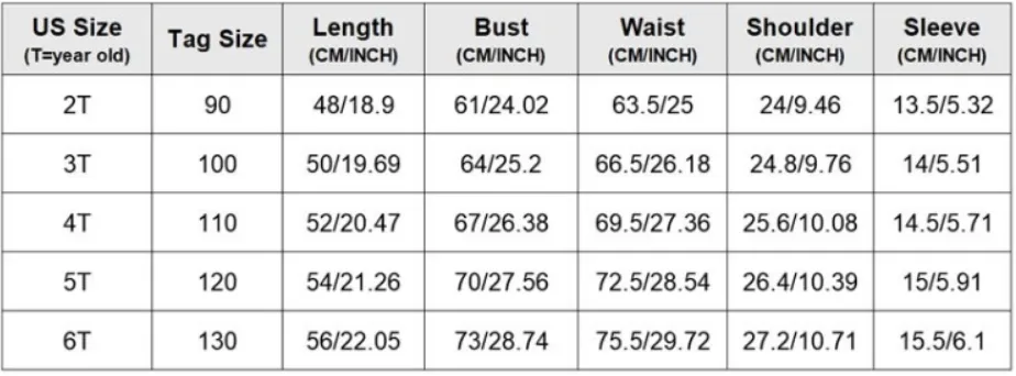 Size: 2T 90cm 3T 100cm 4T 110cm 120cm 130cm