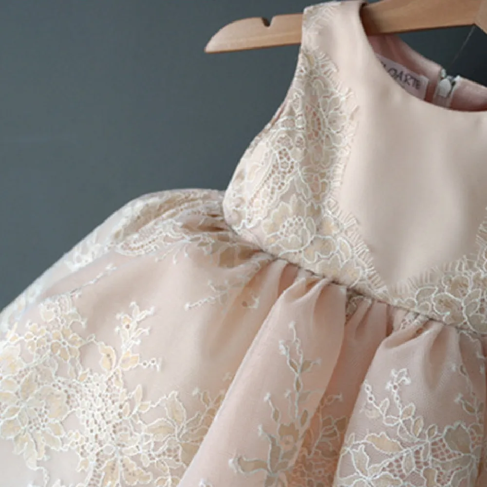 This isn’t just another dress – it’s a fashion-forward take on a classic wedding gown, complete with delicate lace, layered tulle, and flattering details that highlight your child's natural charm.