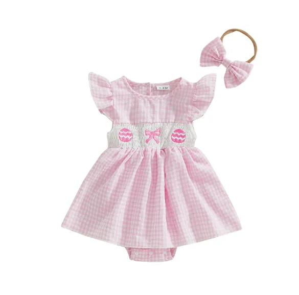 Girls' Plaid Egg Embroidery Smocking Romper