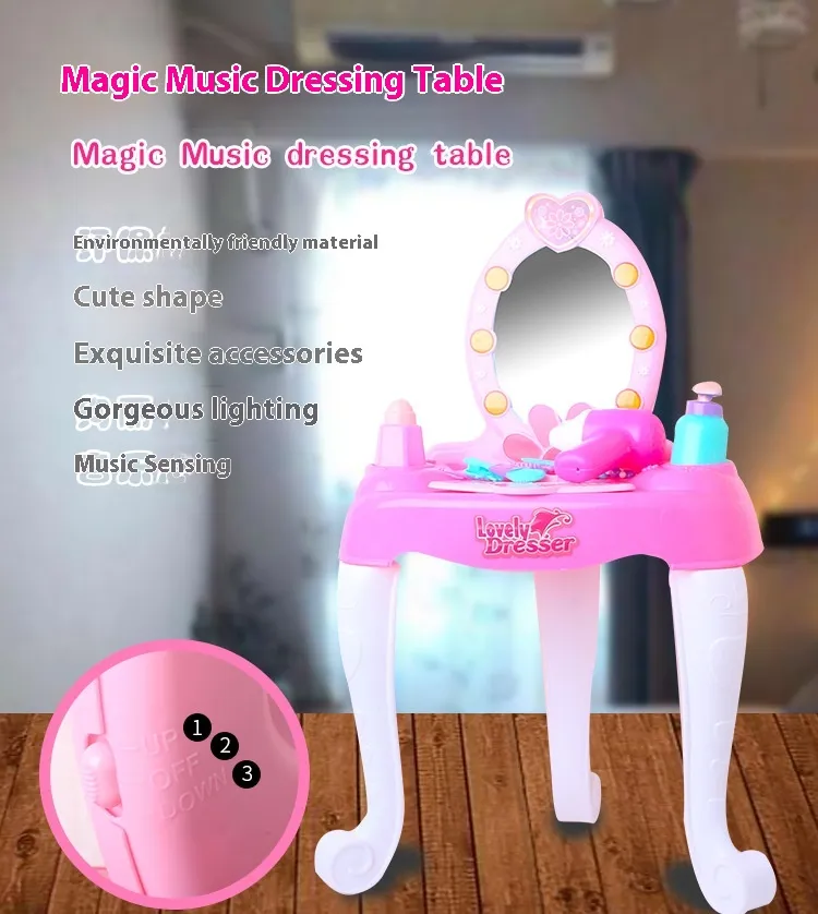 The dressing table includes storage drawers and compartments where children can neatly store their makeup accessories, brushes, and other