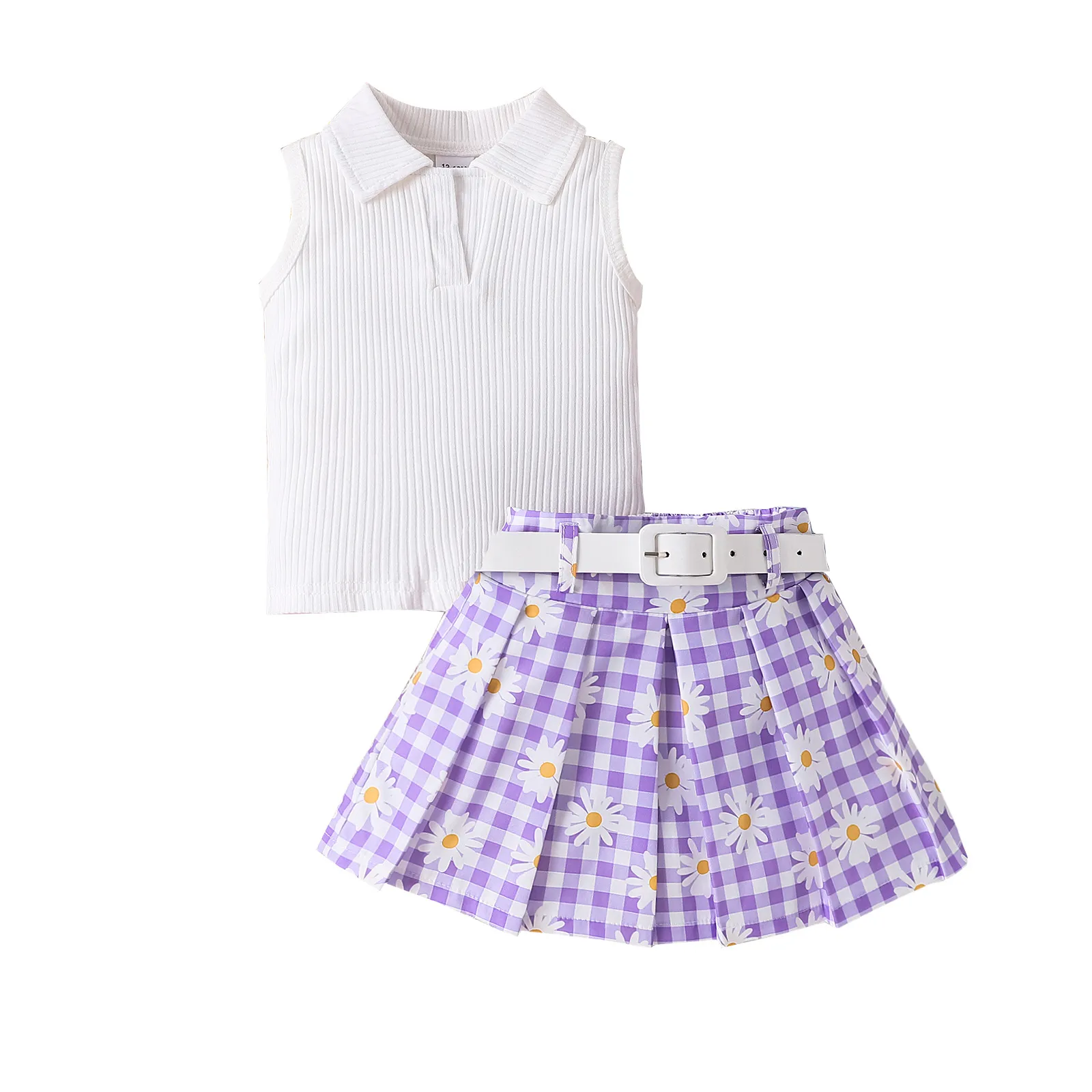 The Girls' Suit Sleeveless Sunken Stripe Top with Daisy Plaid Skirt Belt Three-piece Suit is easy to wear and maintain. The comfortable design and simple styling make it easy to dress your child in the morning, while the durable fabric ensures that the suit will withstand everyday wear and frequent washing. This set is both functional and fashionable, making it an excellent addition to your child’s wardrobe.