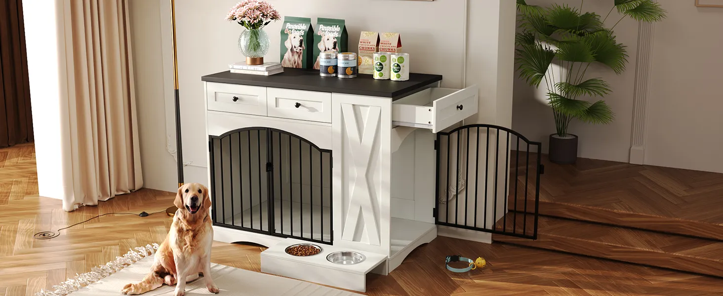 - Furniture Style: The dog cage furniture is designed in a modern furniture style, not only providing a safe and comfortable living space for your pet, but also equipped with 3 practical drawers for convenient storage of toys, snacks and cleaning supplies. In addition, the large desktop space can be used as a side table to enhance your home decoration.