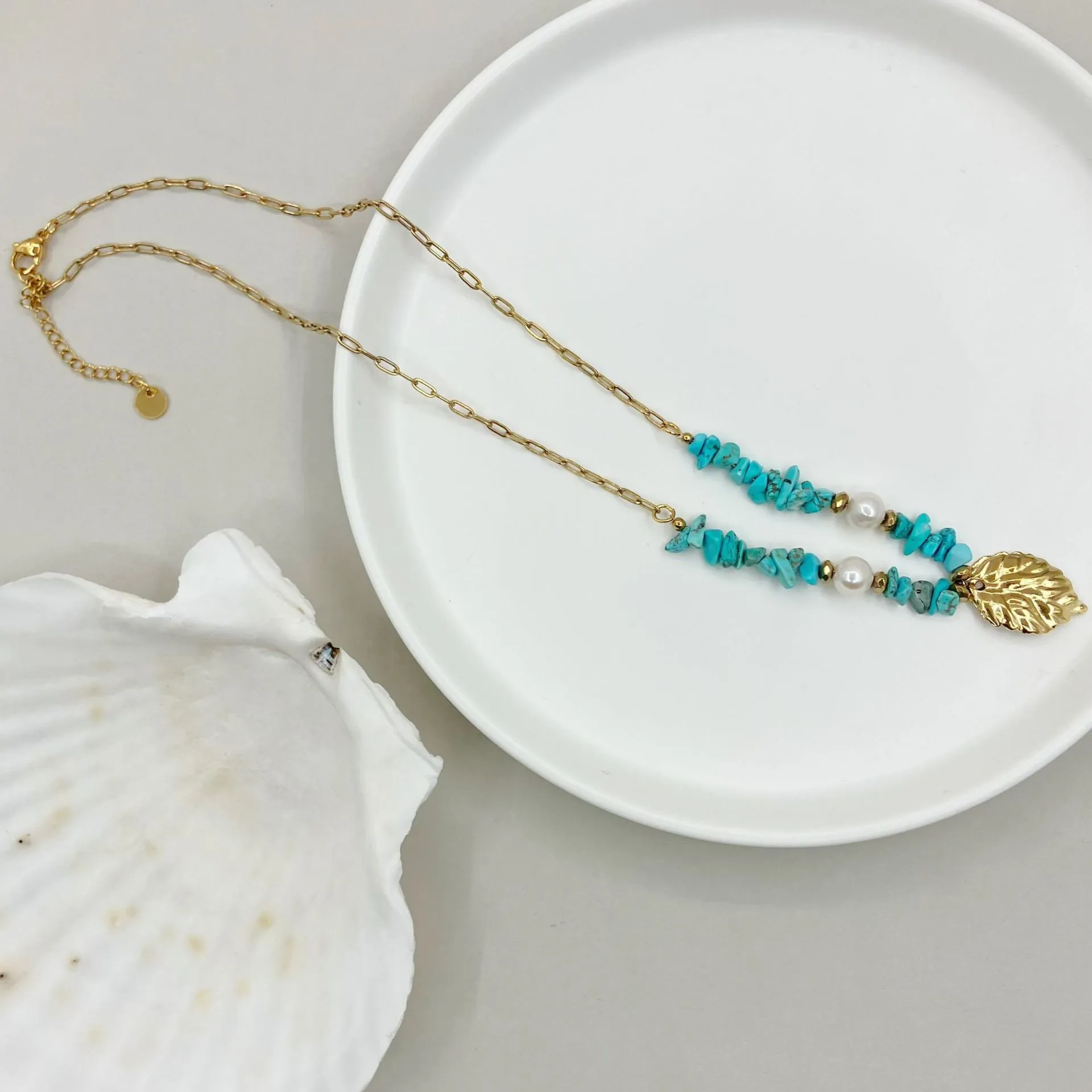 With its natural beauty, elegant design, and versatility, the Gold Blue Natural Stone Leaf Pendant Freshwater Pearl Necklace is the perfect addition to any jewelry collection, offering both style and meaningful symbolism.