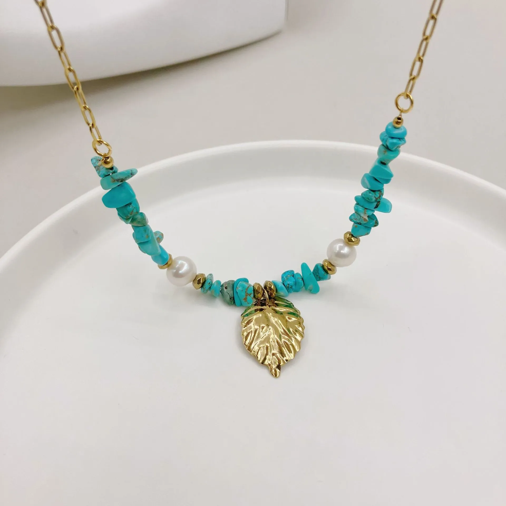 Gold Blue Natural Stone Leaf Pendant Freshwater Pearl Necklace: A Timeless Blend of Elegance and Nature